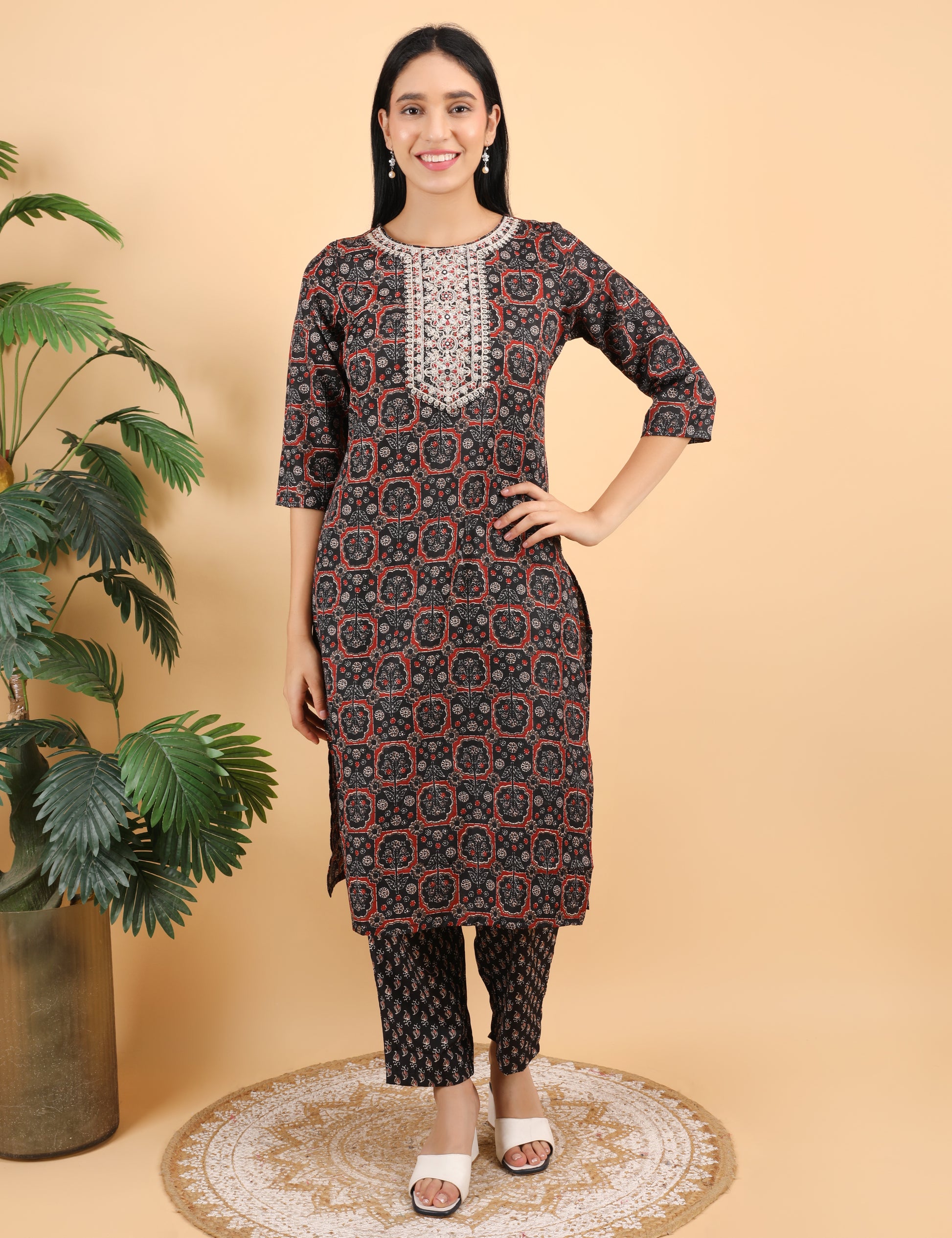 This stylish straight-cut suit set is crafted from soft and breathable cotton fabric, making it perfect for everyday comfort with a refined ethnic look. The suit comes in a rich black base, highlighted with traditional block prints in earthy tones that add a charming handcrafted appeal. The centerpiece of the kurta is its beautifully embroidered neckline, featuring elegant golden dori and resham work, further enhanced with delicate mirror embellishments that bring a festive sparkle to the look. Paired with a coordinated printed bottom and matching dupatta, this outfit blends tradition with effortless style.