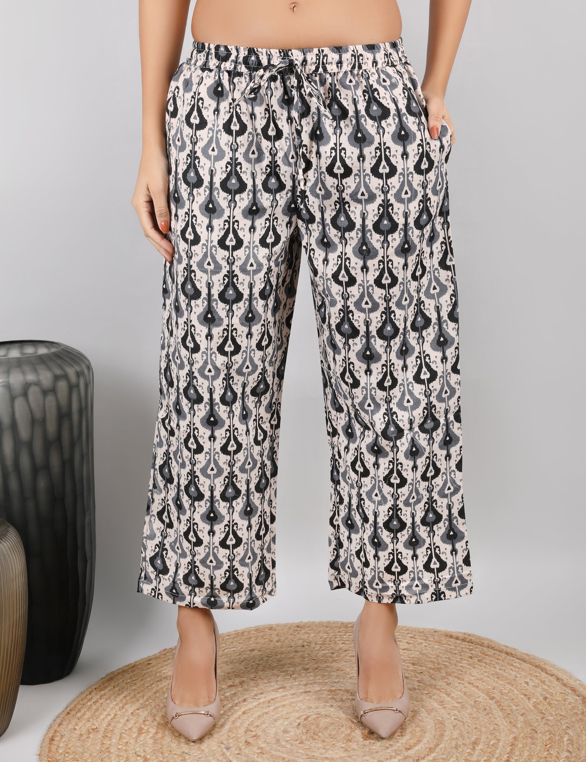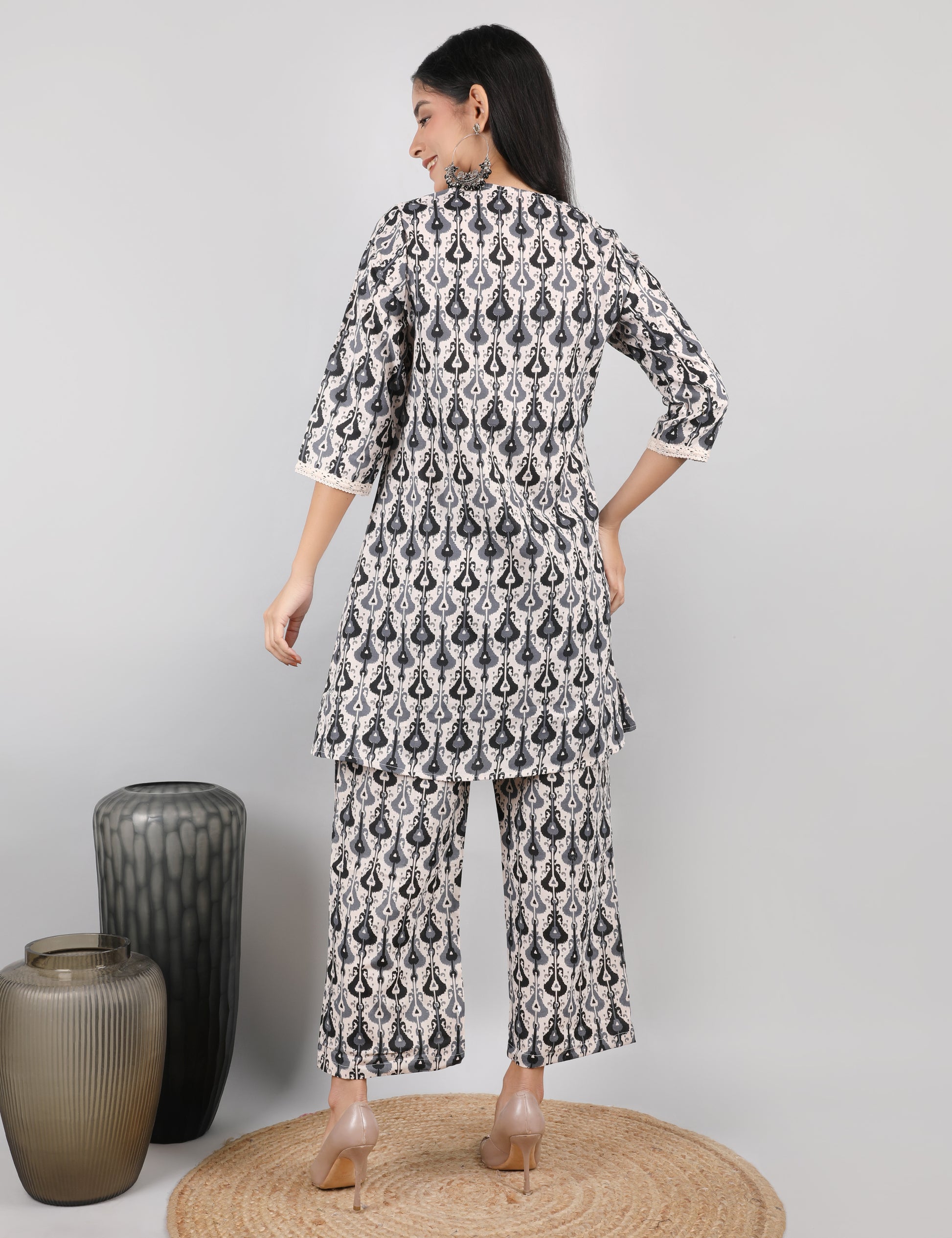 This elegant co-ord set is crafted from cotton fabric, offering soft comfort and breathability for everyday wear. The outfit features an intricate all-over ethnic-style print in contrasting tones, giving it a stylish and modern appeal. The kurta is designed with a flattering V-neckline and 3/4th sleeves, both beautifully finished with delicate crocia lace, adding a graceful feminine touch. Paired with matching straight-fit pants, this co-ord set is perfect for office, casual outings, or daily wear.
