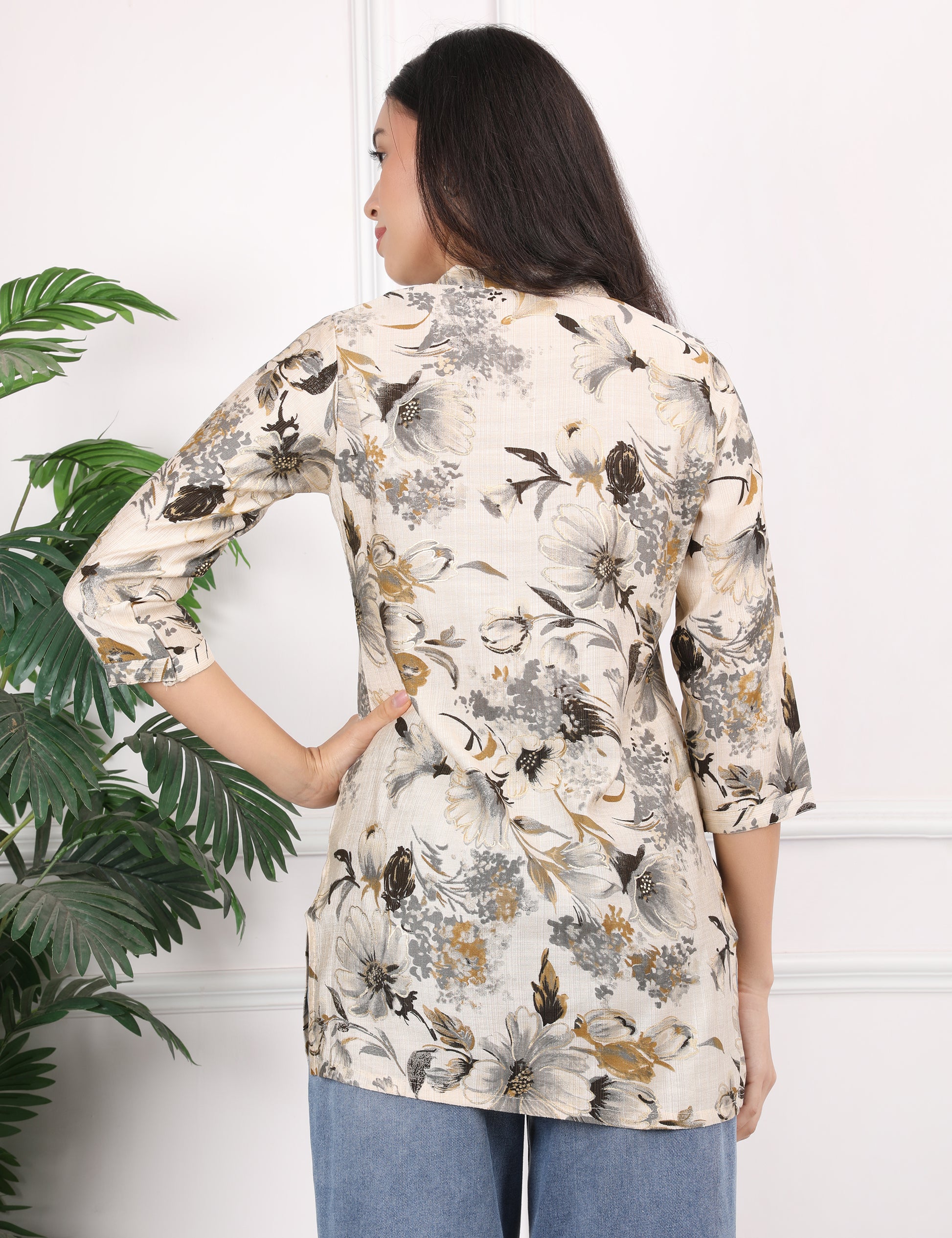 This elegant short kurti is crafted from soft, skin-friendly cotton fabric, ensuring breathable comfort throughout the day. Designed in a soothing cream base colour, it is beautifully highlighted with a graceful floral print in subtle shades of grey and mustard, giving it a refined and classy appeal. The kurti features a smart notched neckline with front button detailing, adding a touch of modern sophistication. With its 3/4th sleeves and comfortable fit, this kurti is a perfect choice for office wear as well as college wear, effortlessly blending style and ease.