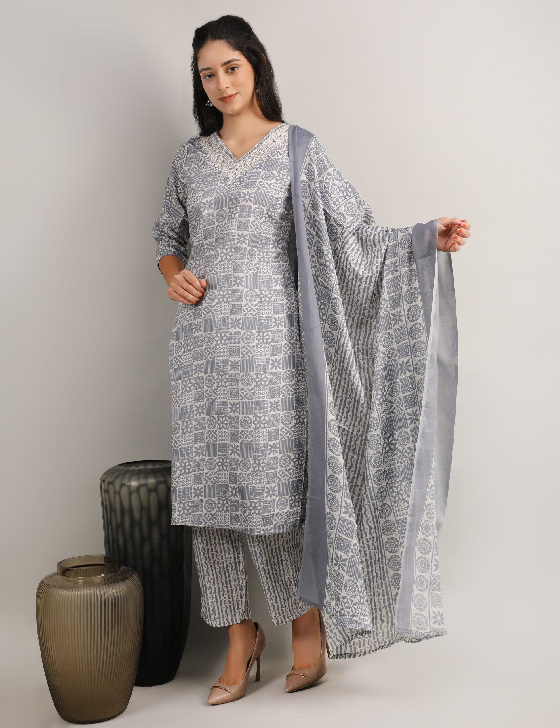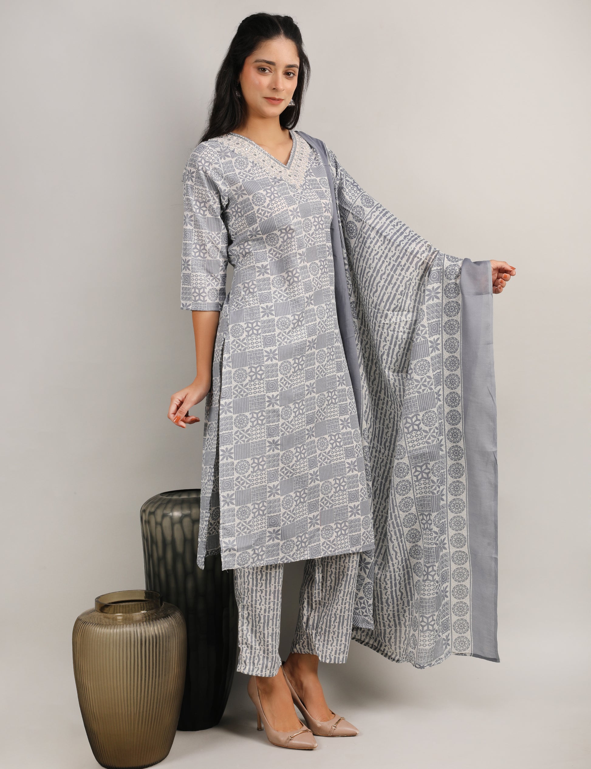 This elegant cotton straight suit set with dupatta comes in a soothing grey and white colour palette, featuring an attractive geometrical block-style print all over. The V-neckline is beautifully highlighted with delicate dori detailing and subtle mirror work, adding a refined ethnic charm to the look. Paired with coordinating printed pants and a matching dupatta, this set offers effortless comfort and style — perfect for daily wear and casual outings.