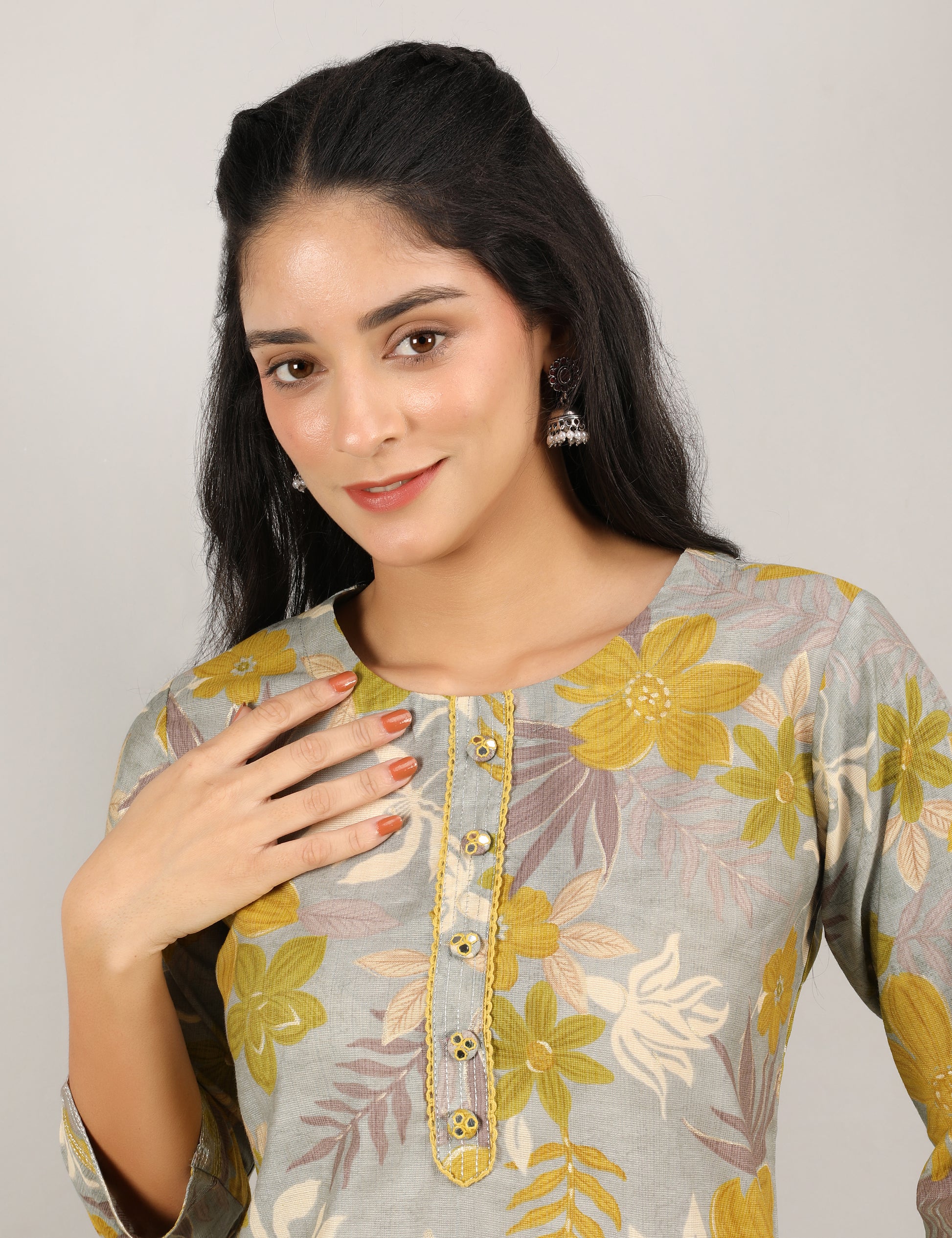 • Neckline: Round neck with button detailing