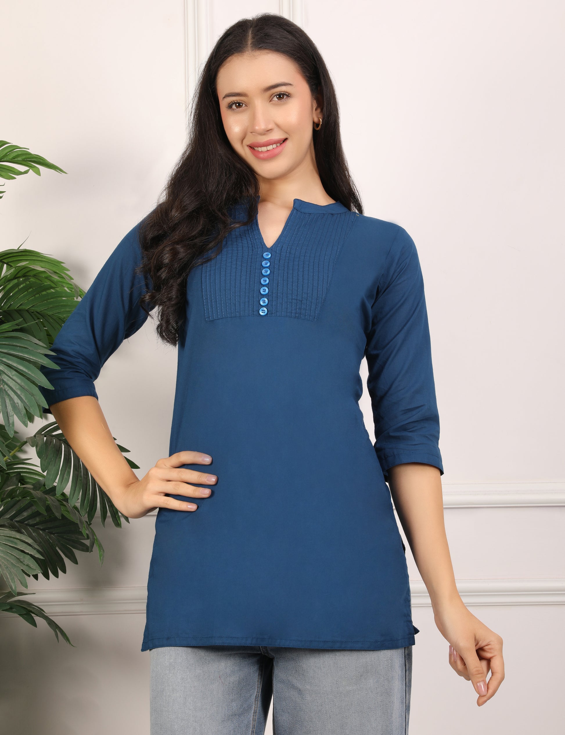 This elegant short kurti is crafted from soft and breathable cotton fabric, ensuring all-day comfort. Designed in a rich indigo blue colour, it offers a classic and timeless appeal. The kurti features a stylish notched neckline highlighted with a neatly stitched pintuck yoke and button detailing, adding subtle texture and charm. Finished with 3/4th sleeves and a straight silhouette, this kurti is perfect for office wear, casual outings, and everyday styling. Pair it with jeans or trousers for an effortlessly polished look.
