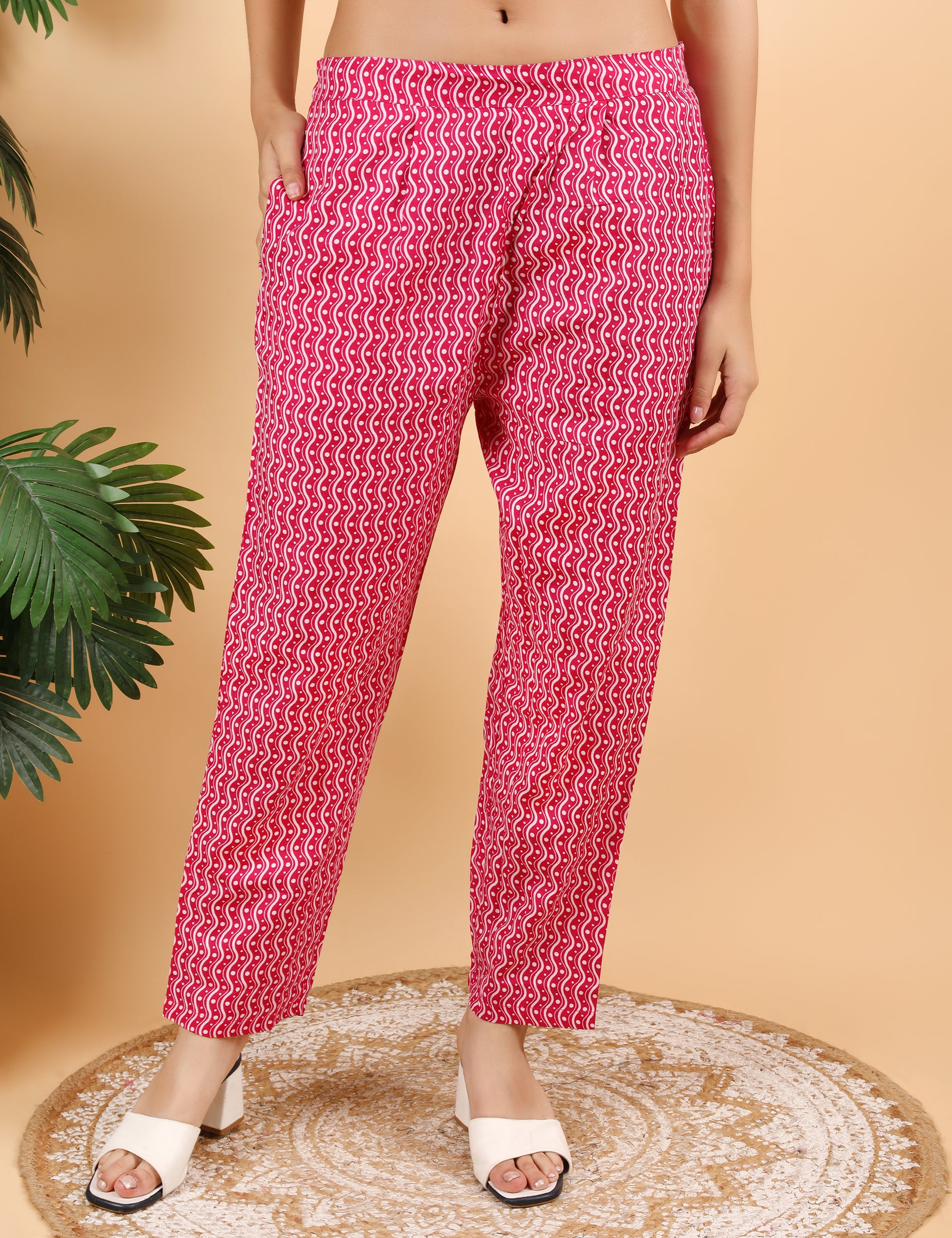Step into effortless elegance with this beautiful cotton suit set in vibrant shades of pink and magenta. The kurta features an eye-catching Bandhani-inspired print with diagonal patterns, perfectly complemented by the matching printed pants. The neckline is highlighted with exquisite embroidery, mirror accents, gold zari and delicate sequin work, giving it a festive and graceful look. The set is paired with a stunning coordinated printed dupatta that adds the perfect finishing touch. Soft, breathable, and stylish — ideal for daily wear, small celebrations, or festive gatherings.
