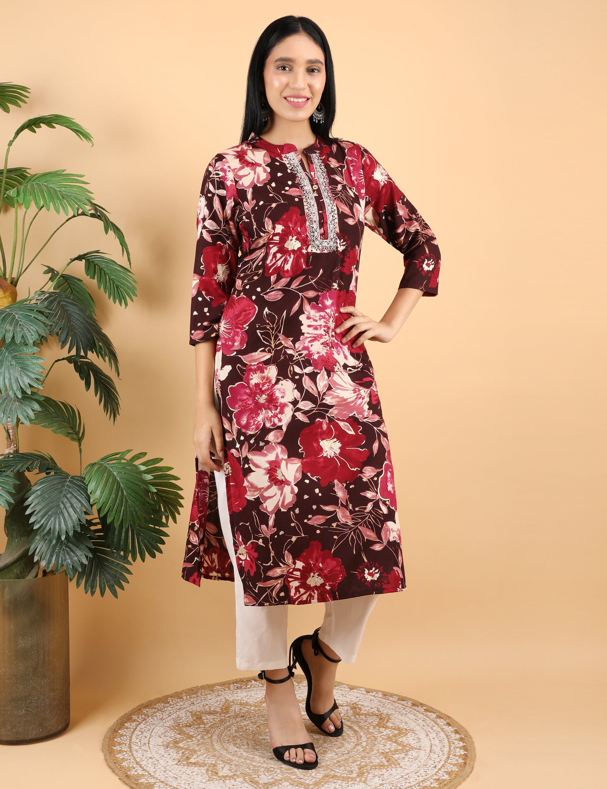 Upgrade your everyday style with this elegant rayon-cotton kurti, designed for comfort and effortless charm. It features a rich maroon base with stunning floral print in shades of red, blush pink and cream, giving it a graceful and feminine appeal. The neckline is beautifully highlighted with delicate golden dori (thread) work, adding a subtle festive sparkle. Finished with 3/4th sleeves and a straight silhouette, this kurti is perfect for work, outings or casual occasions.