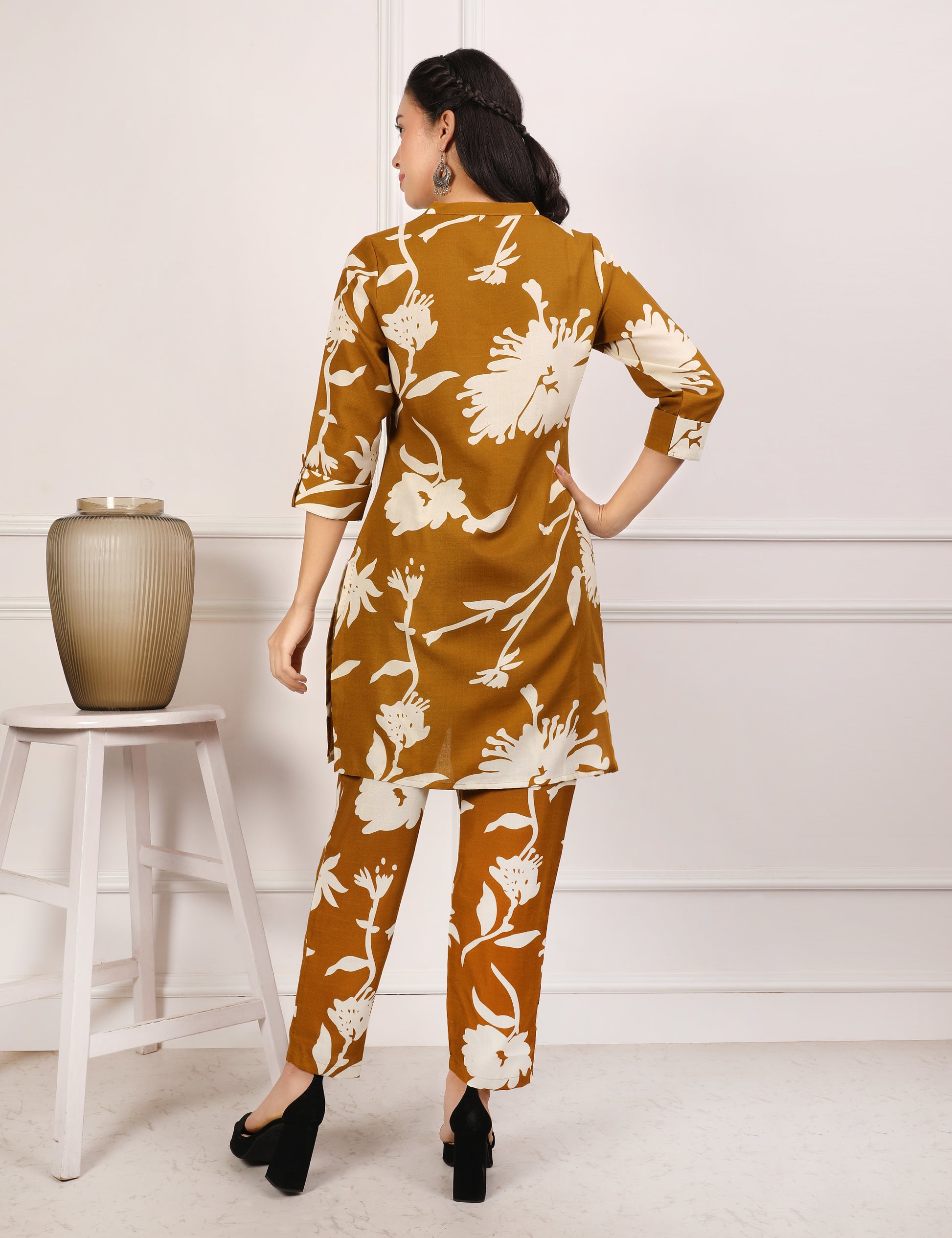 This trendy cotton co-ord set is perfect for effortless everyday elegance. It features a rich mustard-brown base highlighted with bold ivory floral prints, giving it a stylish and contemporary appeal. The kurta is designed with a smart round-split neckline and button detailing, adding a refined ethnic touch. The 3/4th sleeves with button accents and the straight-fit silhouette make it both chic and comfortable. Paired with matching printed straight pants, this coordinated set offers an easy yet fashionable look for daily wear.