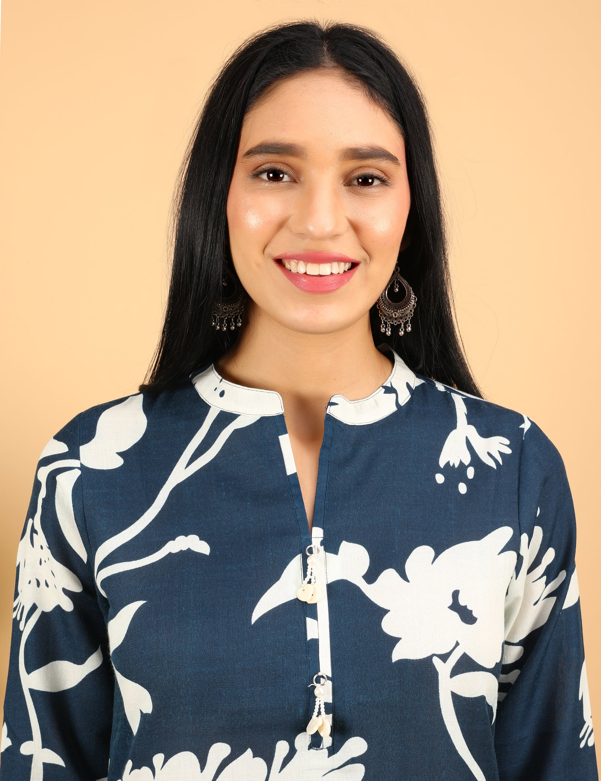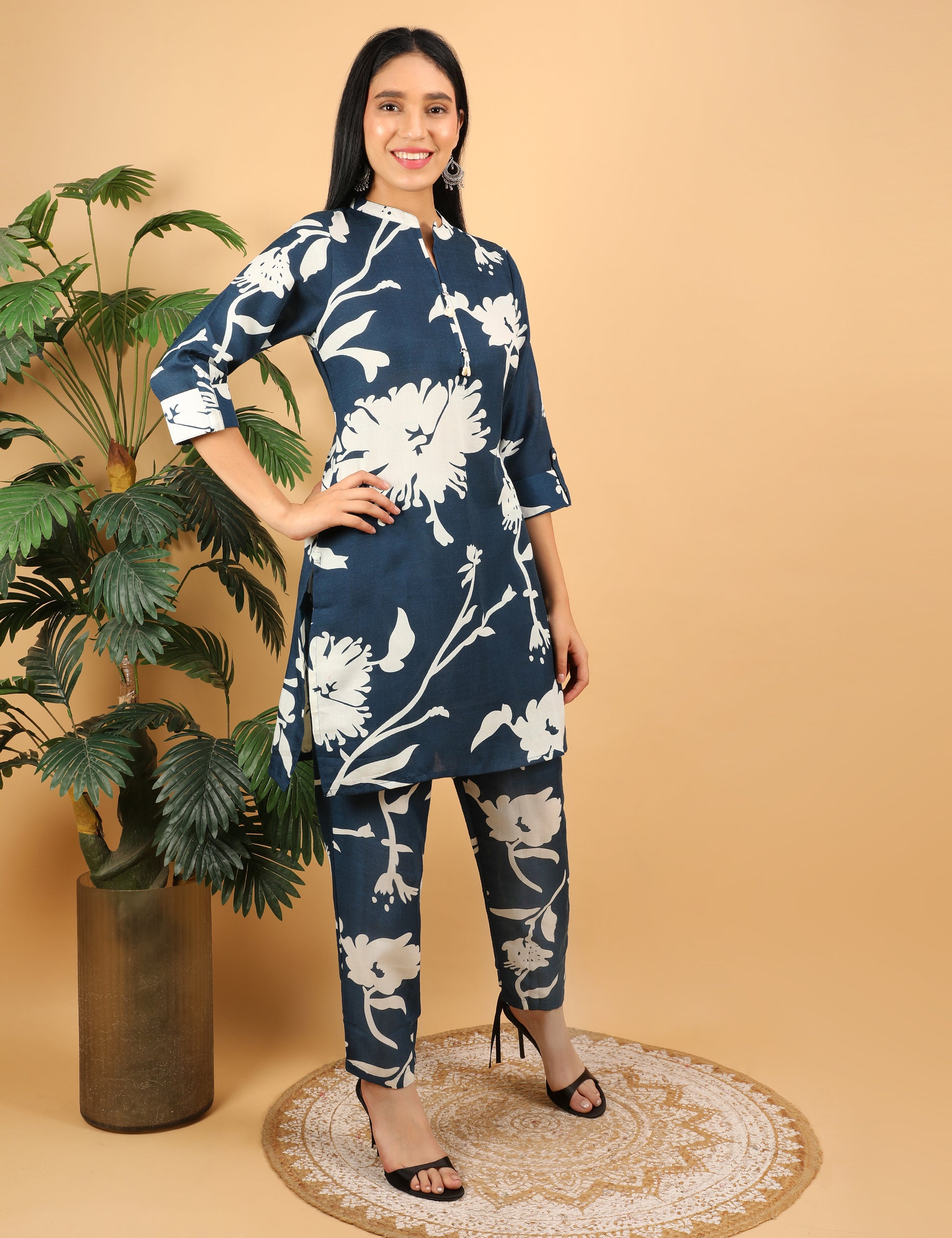 Make a chic style statement with this corset-style cotton kurta set, crafted from soft and breathable fabric for all-day comfort. The set features a stunning deep navy blue base adorned with bold ivory floral print, giving it a modern and elegant appeal. Designed with a smart neckline and 3/4th sleeves, this coordinated kurta and pant set is perfect for work, outings, or casual occasions.