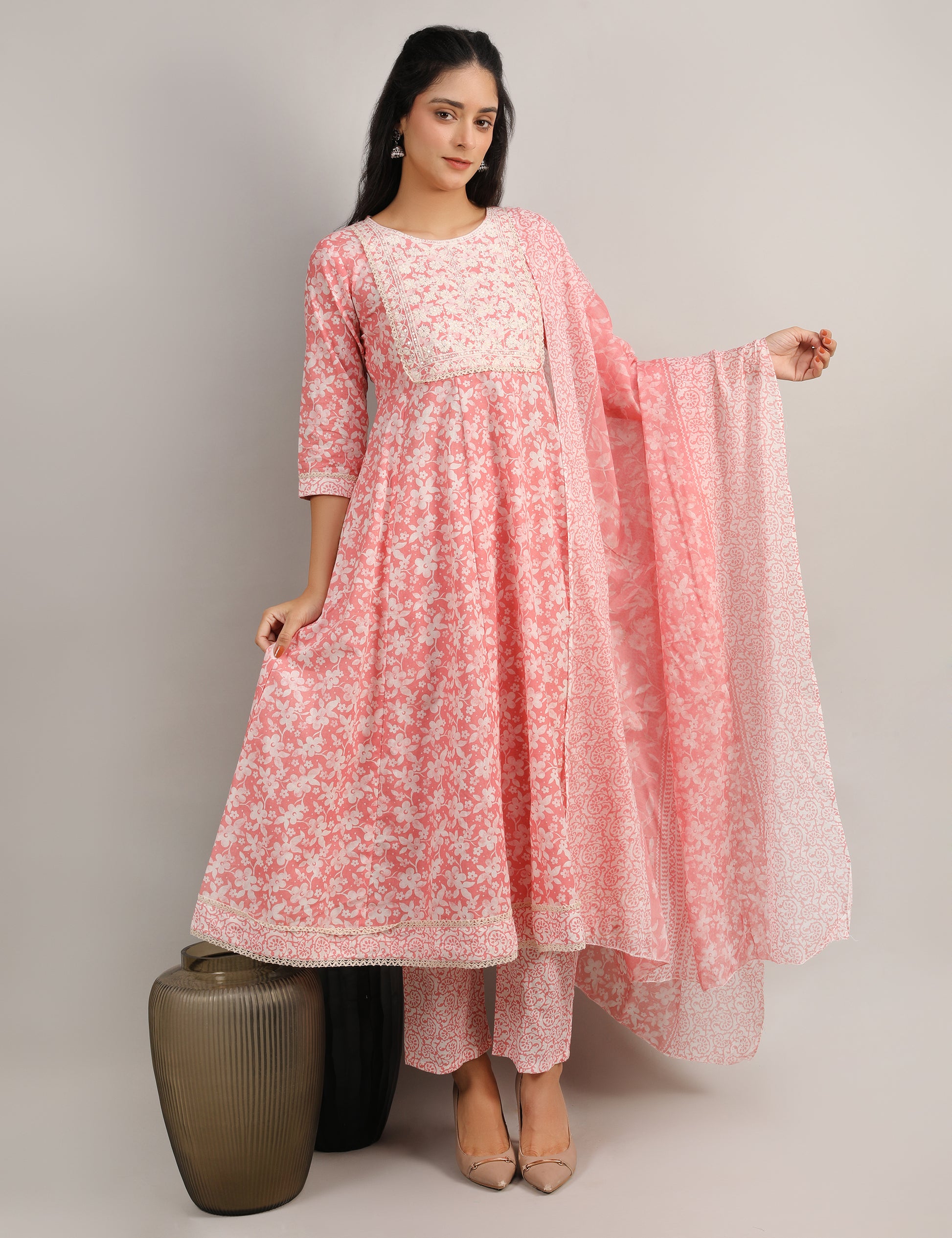 Refresh your ethnic wardrobe with this beautiful peach pink cotton printed Anarkali suit set. Crafted from soft, breathable cotton, the kurta features an all-over floral print and a stunning white thread-embroidered yoke neckline for an elegant finish. Paired with matching printed pants and a lightweight coordinated dupatta, this set offers effortless grace and everyday comfort.