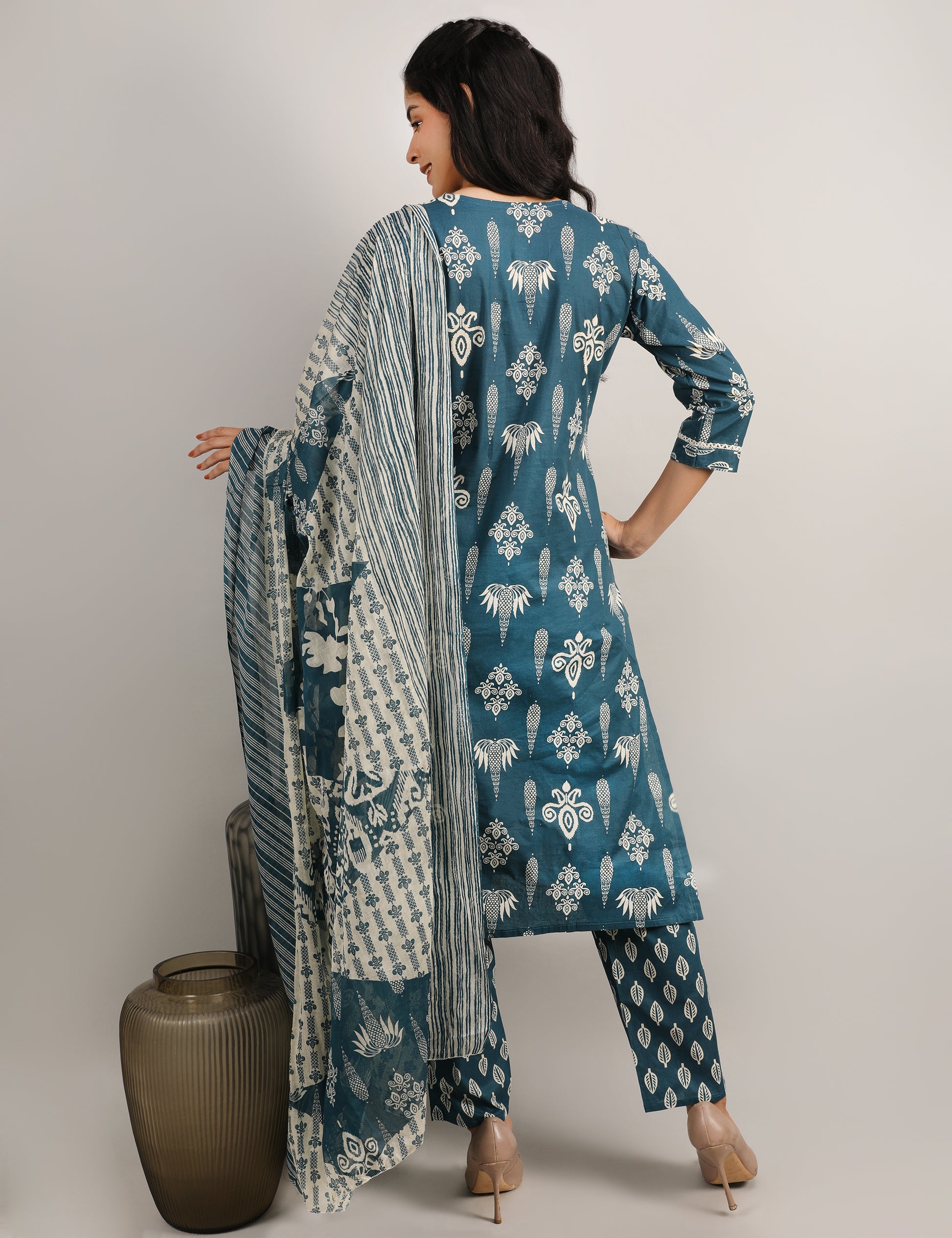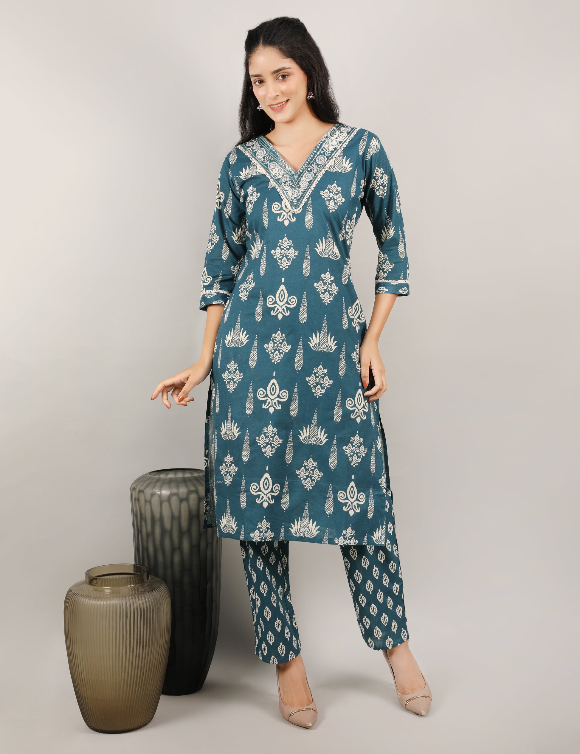 This elegant straight-fit suit set is crafted from soft breathable cotton in a rich teal blue shade with an all-over ethnic white print. The kurta features a stylish V-neckline highlighted with delicate white thread work embroidery, adding a refined touch. Paired with matching printed pants and a coordinated dupatta, this set is perfect for everyday elegance and comfort.