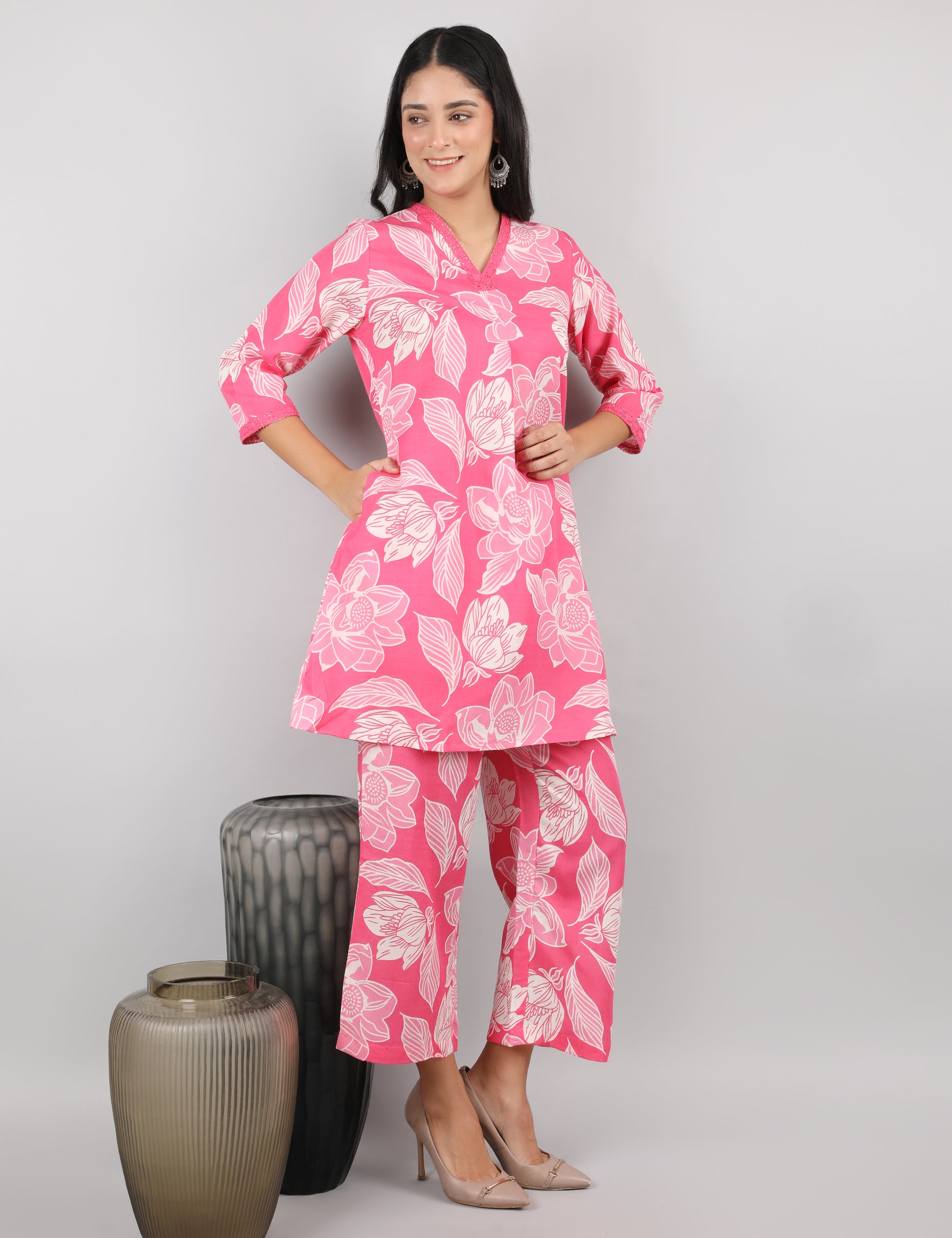 Add a fresh burst of colour to your wardrobe with this stunning kurta set crafted from soft and breathable cotton fabric. The outfit comes in a vibrant pink base beautifully enhanced with a bold white floral print, giving it a lively, youthful and stylish appeal. The kurta features a smart V-neckline with delicate stitching detailing along the edge, adding a refined touch to the design. Fine pleat detailing at the front enhances the fall and shape of the kurta, making it flattering and comfortable to wear. The 3/4th sleeves are finished with subtle lace-look edging that adds a graceful finish. Paired with matching printed straight pants, this set strikes the perfect balance between comfort and chic style — ideal for day outings, casual gatherings, workwear or festive moments.