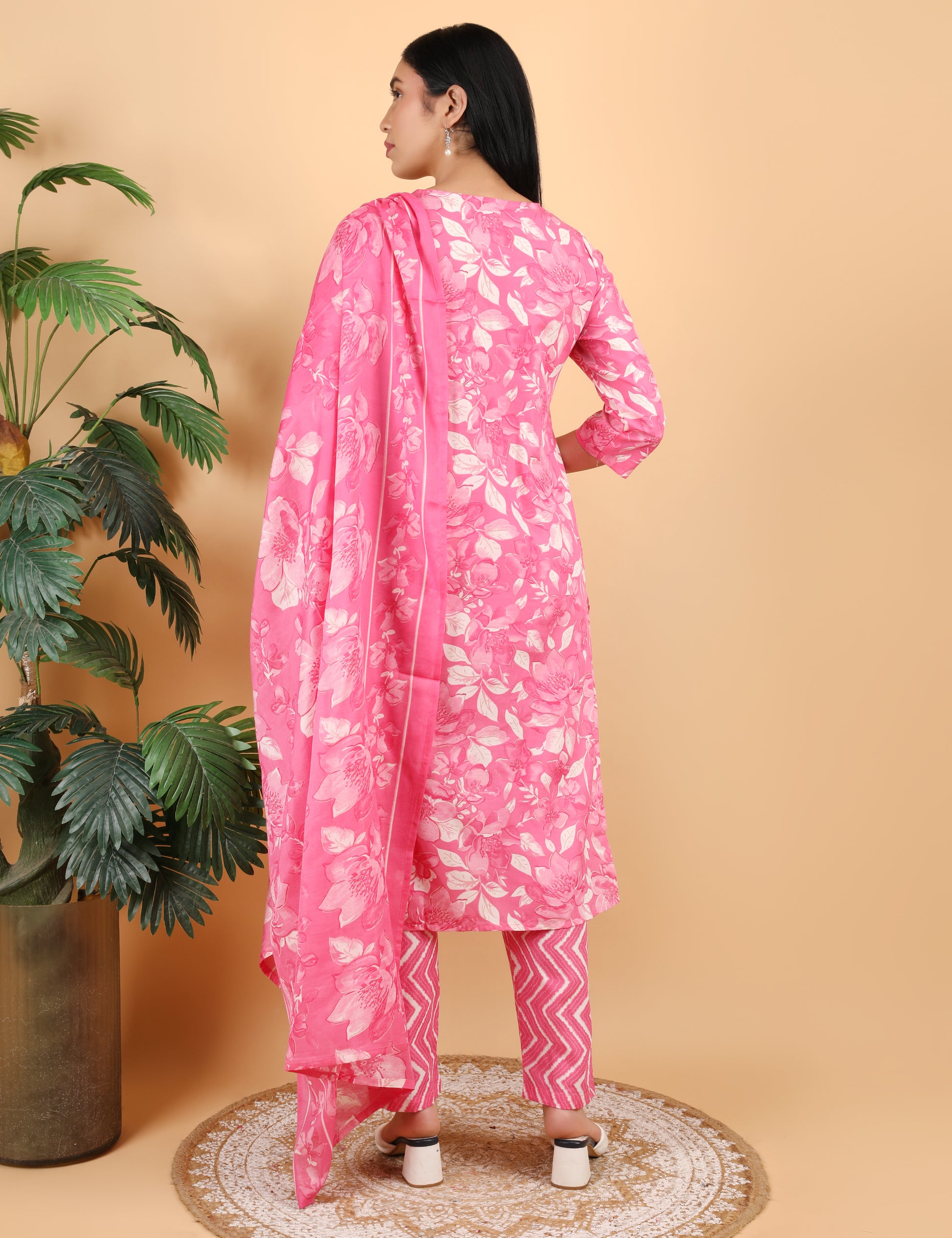 This beautiful straight cotton suit set is designed for effortless everyday elegance. The suit features a vibrant pink base highlighted with soft floral prints that add a feminine and refreshing charm. The neckline is richly embellished with mirror detailing, resham thread embroidery, and delicate dori work, giving it a refined festive appeal without being overpowering. The set is paired with a matching lightweight printed dupatta and contrast printed bottoms, making it perfect for both casual outings and small celebrations.