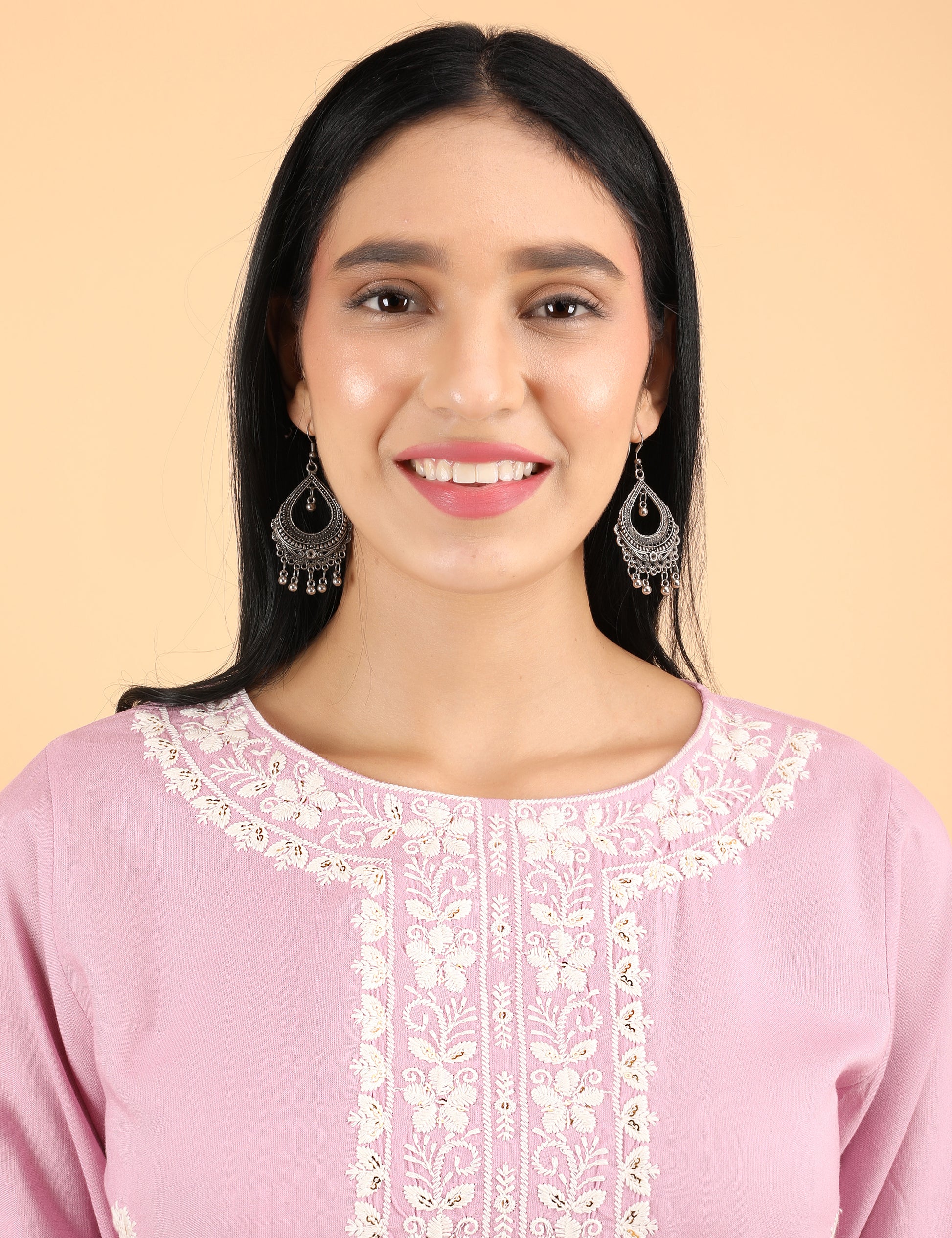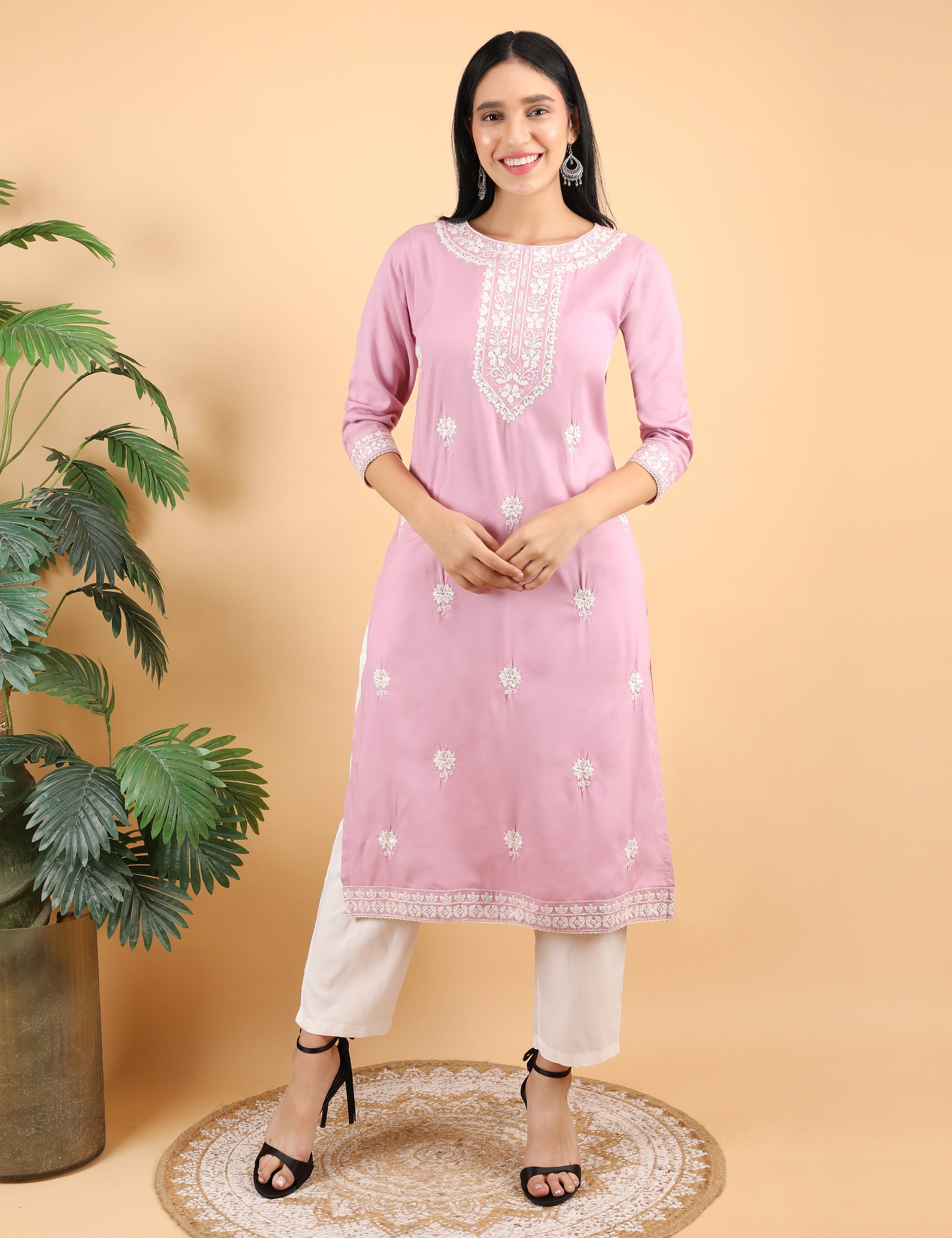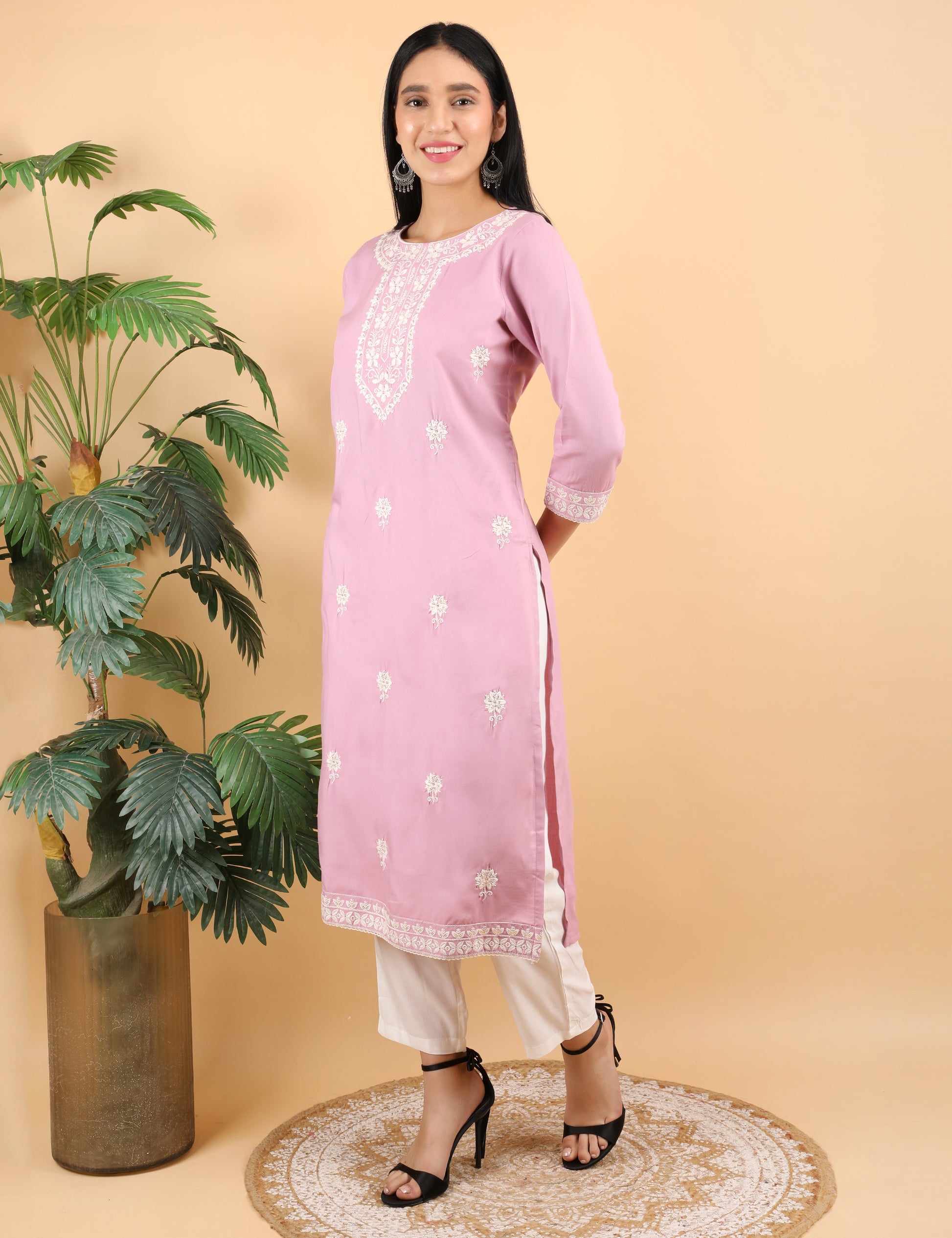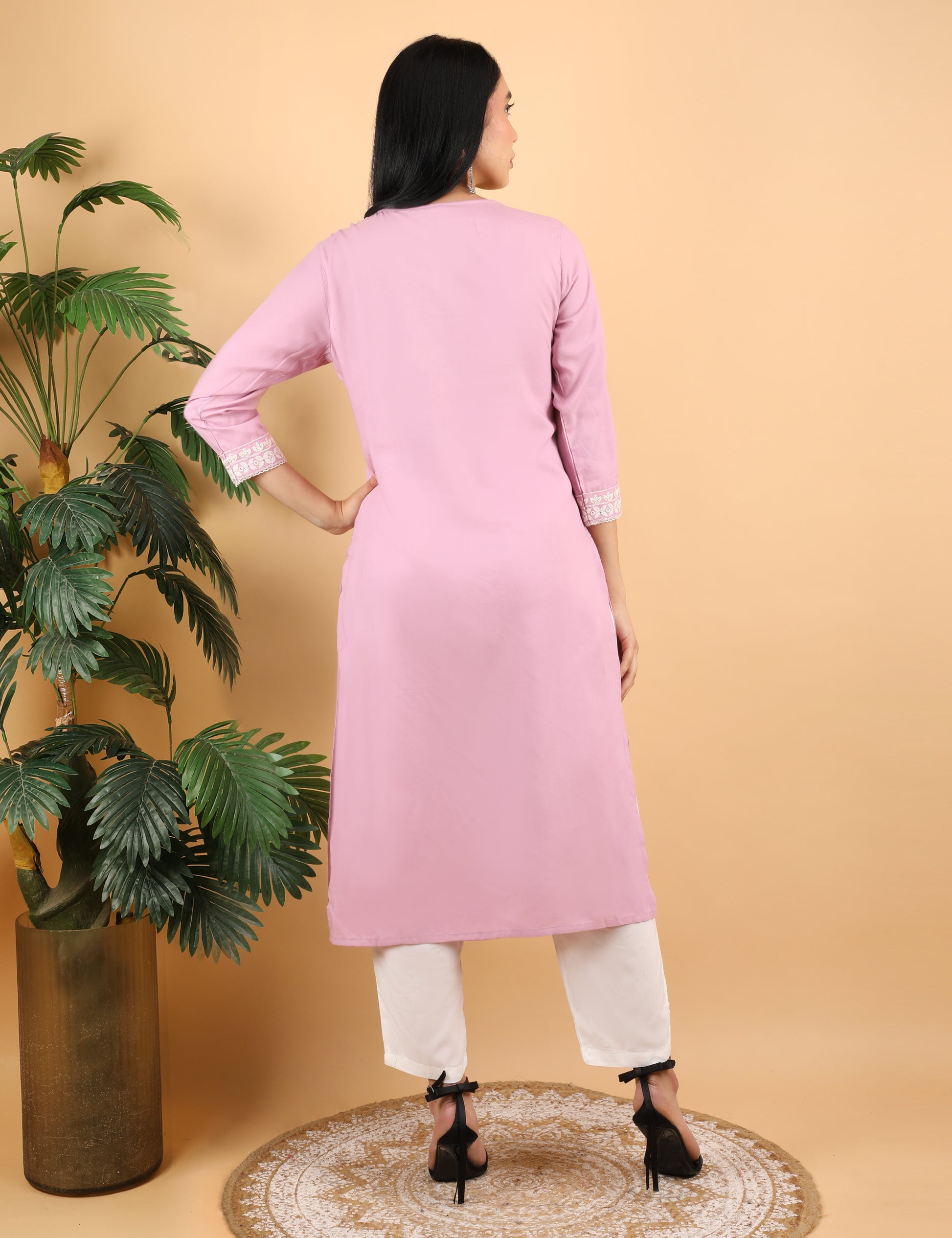 This elegant pink rayon kurta features beautiful chikankari-style embroidery on the neckline, sleeves, and daman, giving it a refined and feminine look. The soft rayon fabric ensures all-day comfort, making it perfect for daily and office wear. The straight silhouette with 3/4th sleeves adds a graceful touch to your style.