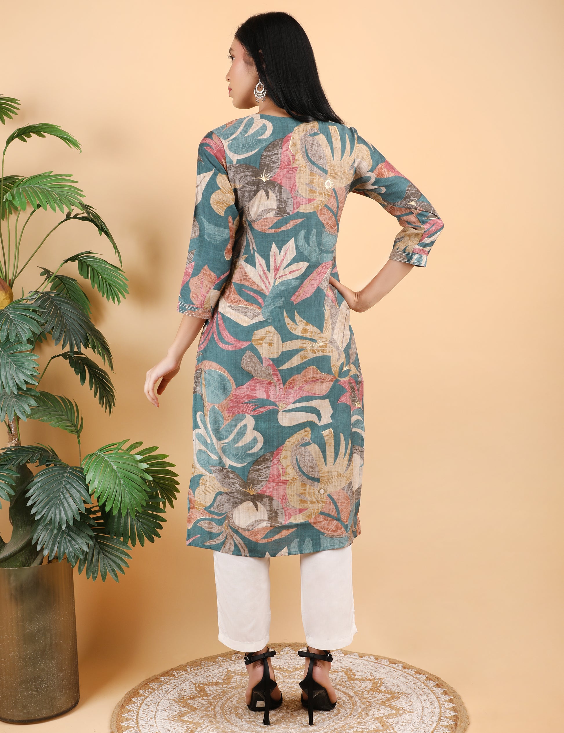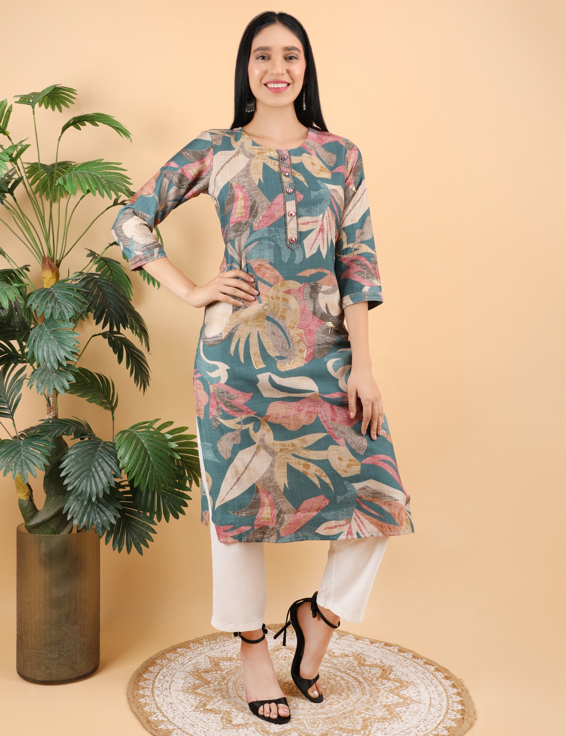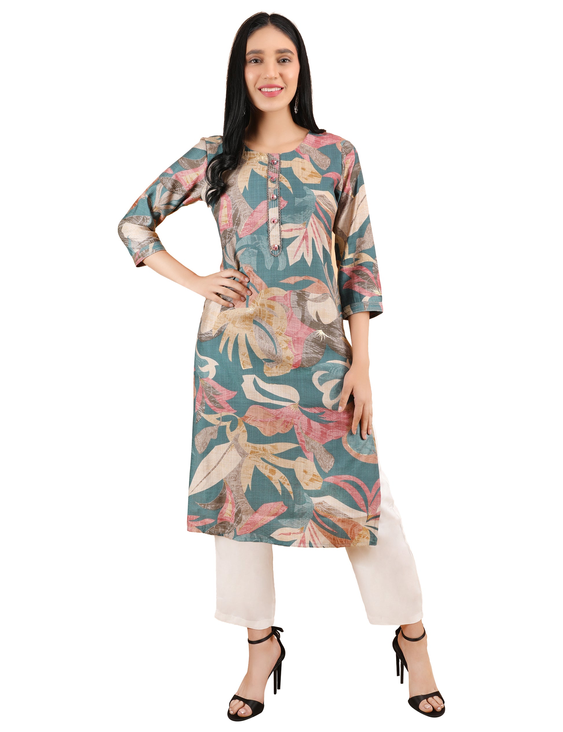 Crafted from soft, breathable fabric, it ensures all-day comfort. The round neckline is enhanced with a stylish button placket, while the 3/4th sleeves add to its contemporary appeal. Pair it with white trousers, palazzos, or leggings for a refined ethnic-fusion look.