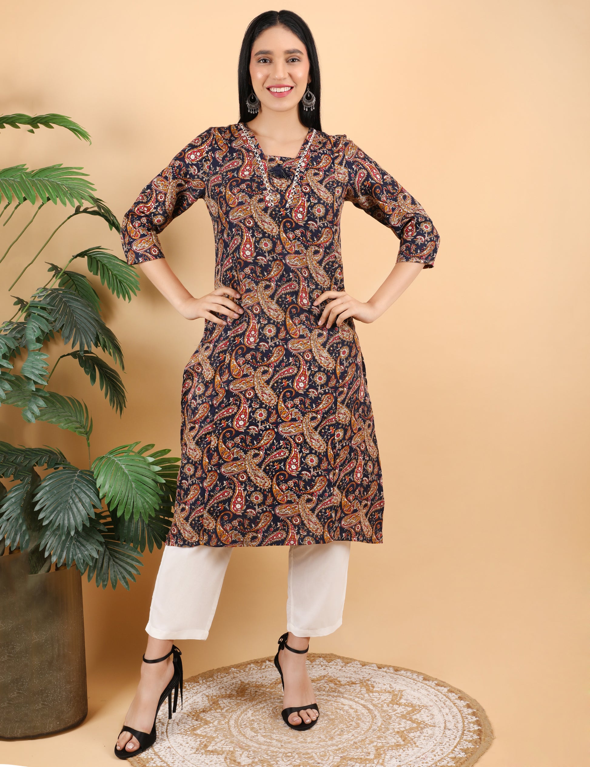 Step into effortless style with this beautifully designed printed kurti. Crafted from soft, breathable fabric, it features an intricate paisley-inspired pattern in rich earthy tones that add a touch of traditional charm. The 3/4th sleeves and straight-cut silhouette offer a flattering fit, while the subtle neckline detailing enhances its elegant appeal.
